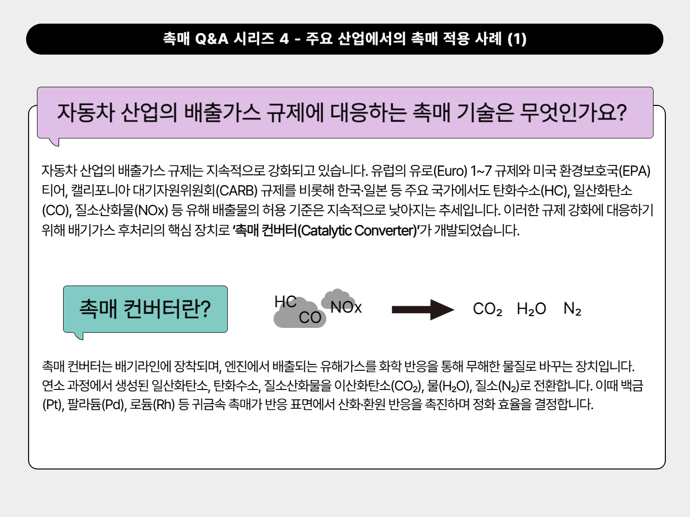 지난 3편에서는 산업별로 촉매가 달라져야 하는 이유와 공정 조건이 촉매 선택에 어떤 영향을 미치는지 살펴보았습니다. 이어지는 4–5편에서는 주요 산업에서의 촉매 적용 사례를 순차적으로 소개합니다. 이번 편에서는 자동차 산업과 반도체 산업을 중심으로 각 산업의 환경 규제와 공정 특성에 따라 어떤 촉매 기술이 활용되고 있는지 알아보겠습니다.
