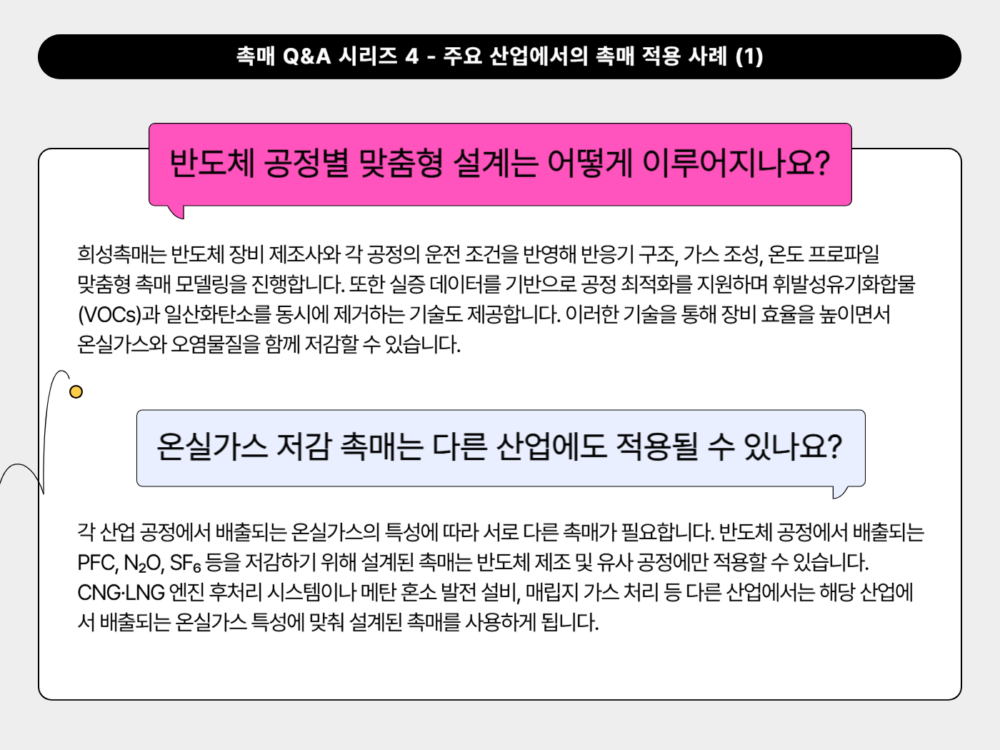 각 산업 공정에서 배출되는 온실가스의 특성에 따라 서로 다른 촉매가 필요합니다. 반도체 공정에서 배출되는 PFC, N₂O, SF₆ 등을 저감하기 위해 설계된 촉매는 반도체 제조 및 유사 공정에만 적용할 수 있습니다.
